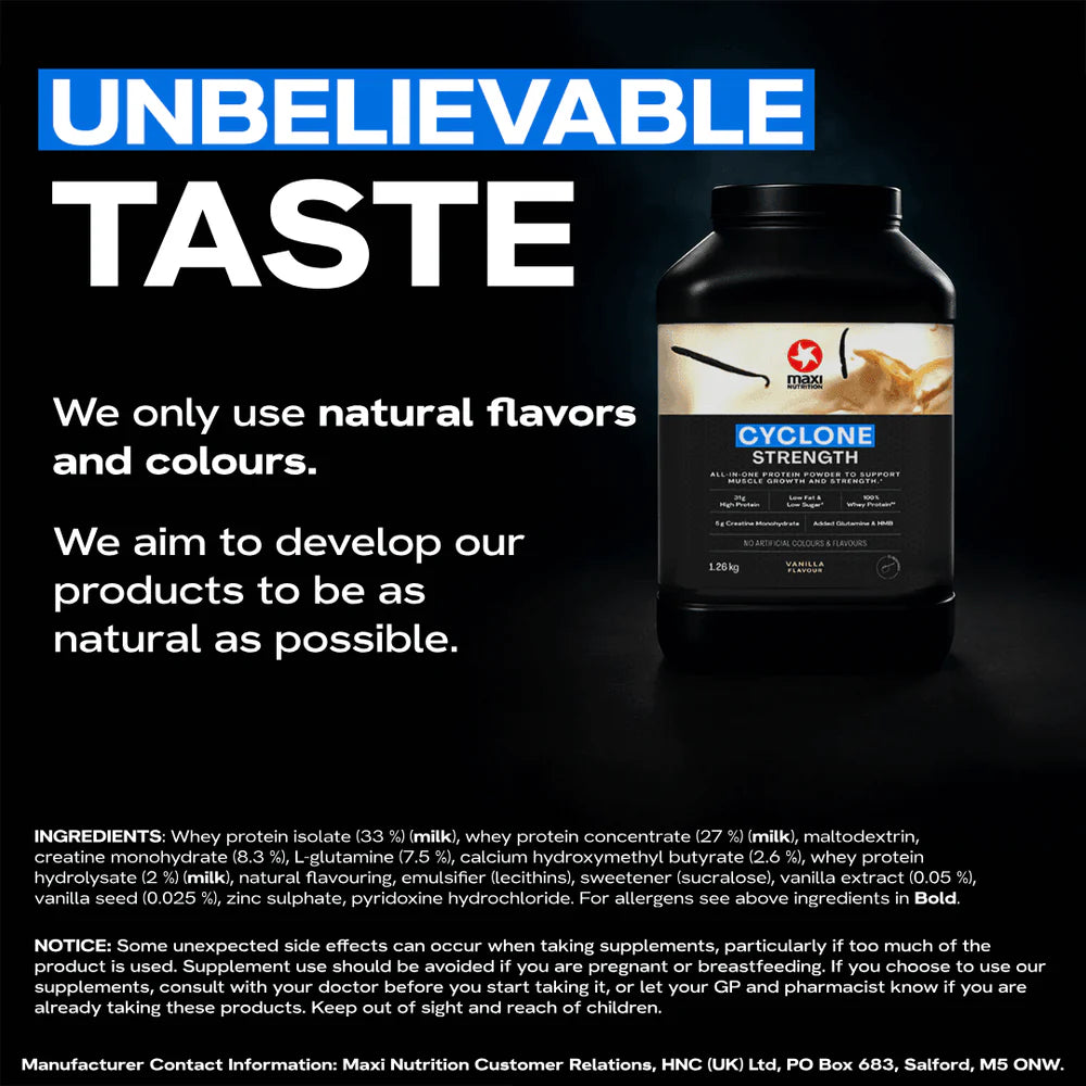 MaxiNutrition Cyclone es el suplemento con proteína y creatina de confianza en Europa, diseñado científicamente para ayudarte a ganar masa muscular, acelerar la recuperación y mejorar el rendimiento. Tanto si eres deportista, vas al gimnasio con regularidad o entrenas con carga, Cyclone te aporta todo lo que necesitas tras el entrenamiento, en una única fórmula eficaz.